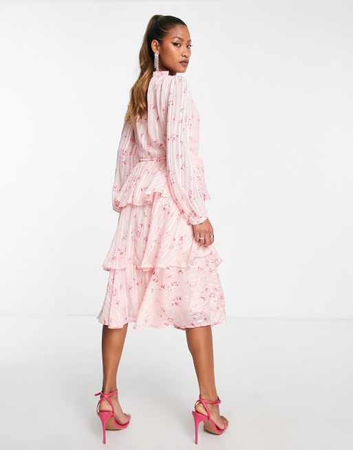 Vila Long Sleeve Tiered Chiffon Midi Dress In Pink Floral Asos